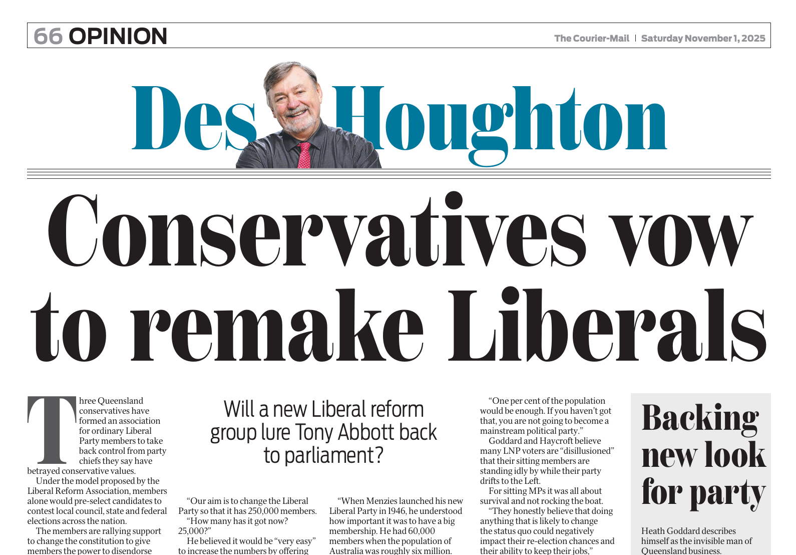The Courier Mail Columnist Des Houghton says the Liberal Reform Association believes the “bosses” in charge of the Liberal Party have “betrayed the conservative values”.